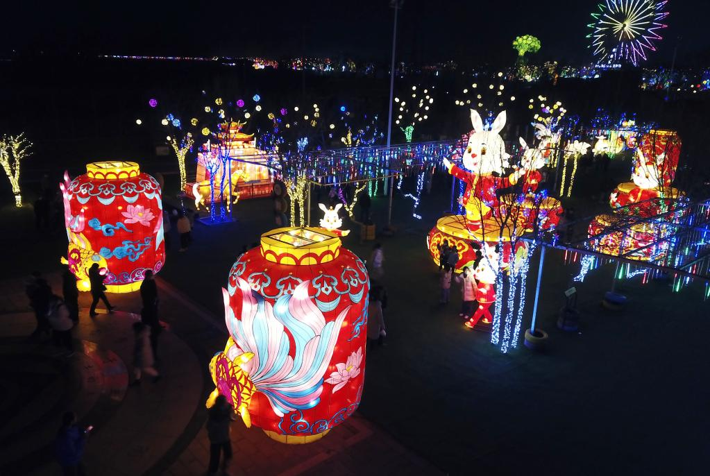 这是1月31日晚在山东省淄博市张店区玉黛湖公园拍摄的花灯(无人机照片)。