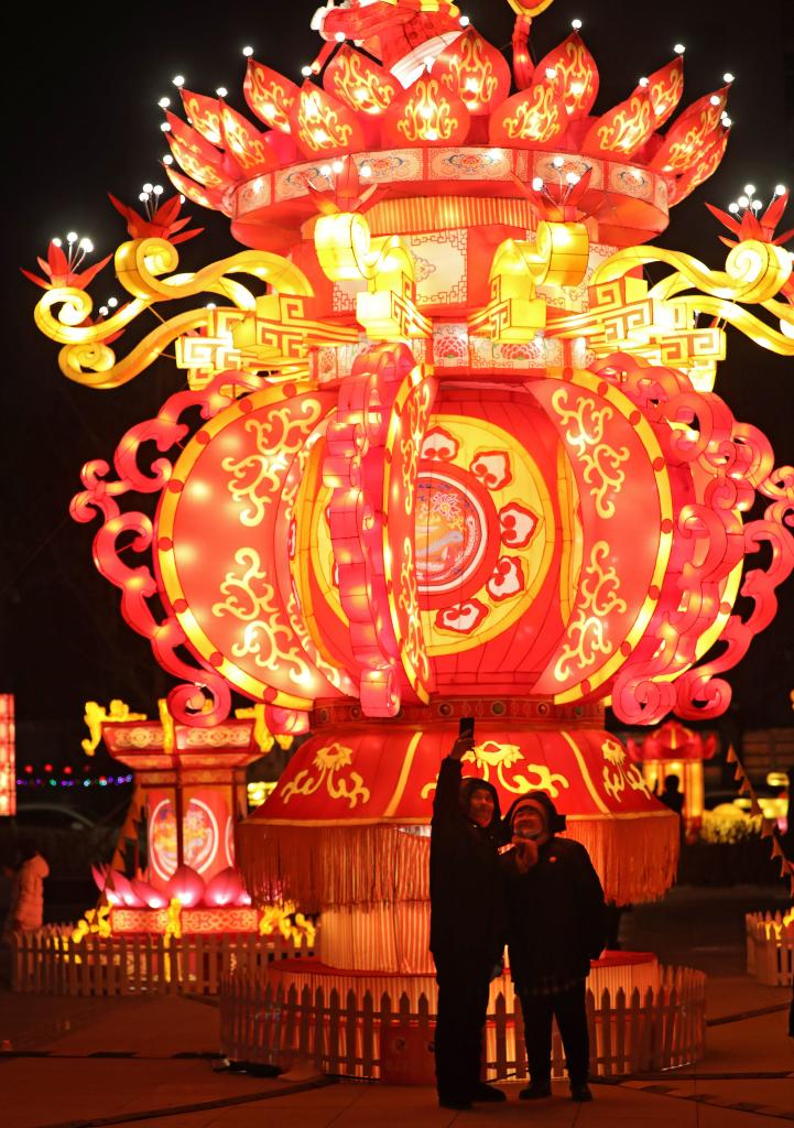 1月15日,两位老人在沈阳故宫门前广场的花灯前拍照留影。