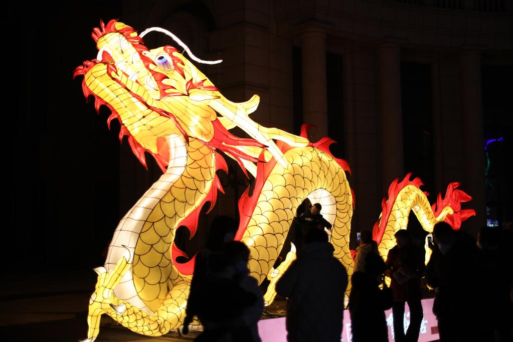 2月3日,游客在营口辽河老街观赏龙形花灯。