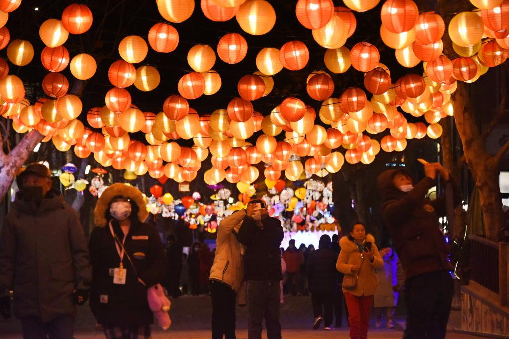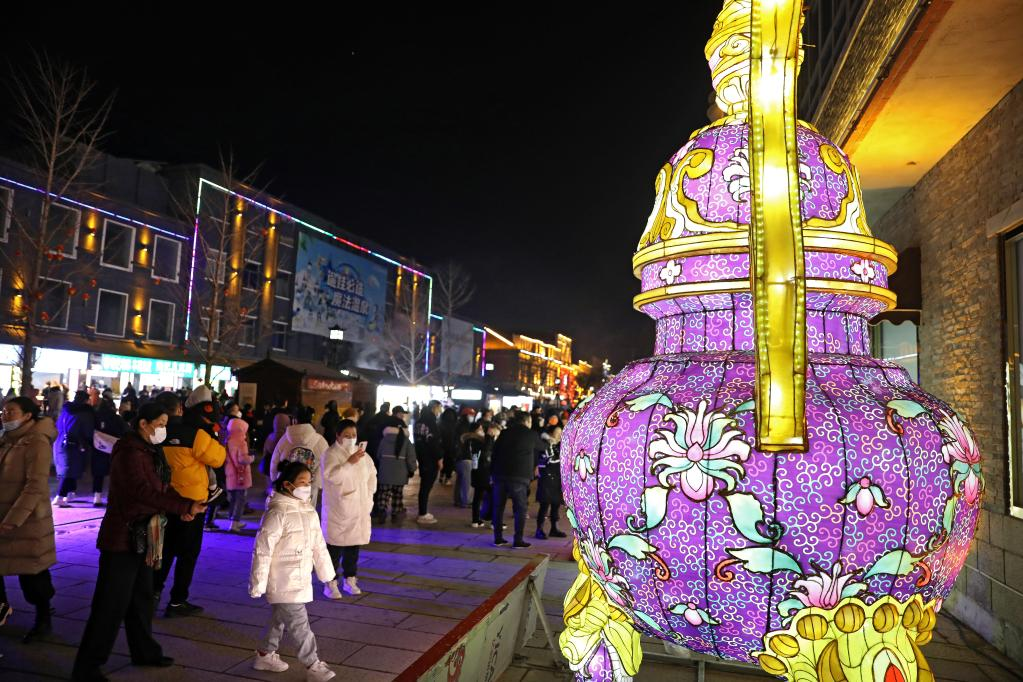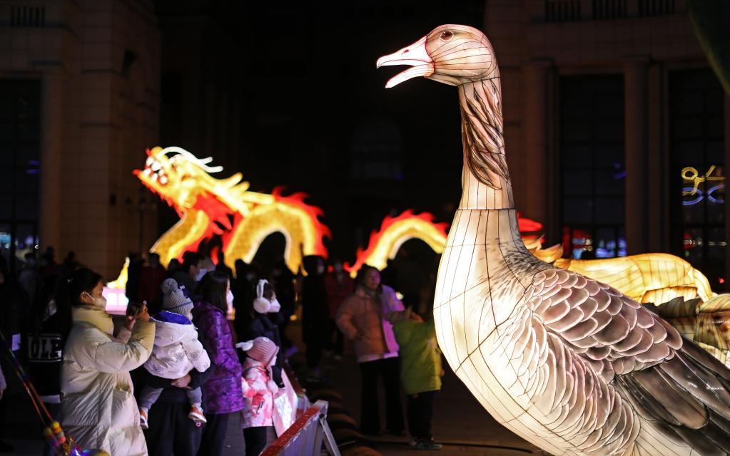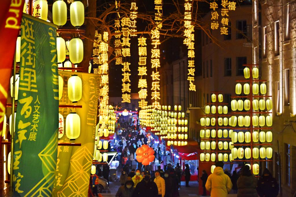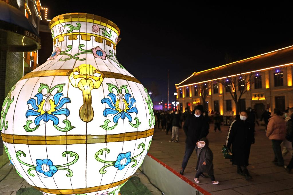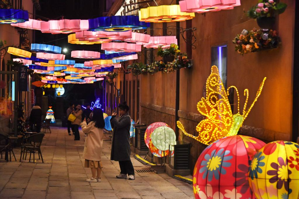 元宵节临近,青岛市市南区“逛街里”新春灯会上的璀璨花灯点亮了老城区的大街小巷,吸引人们前来赏灯。