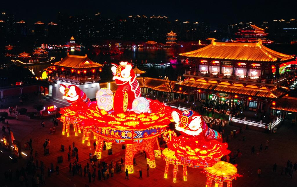 1月24日拍摄的西安大唐芙蓉园内的花灯(无人机照片)。