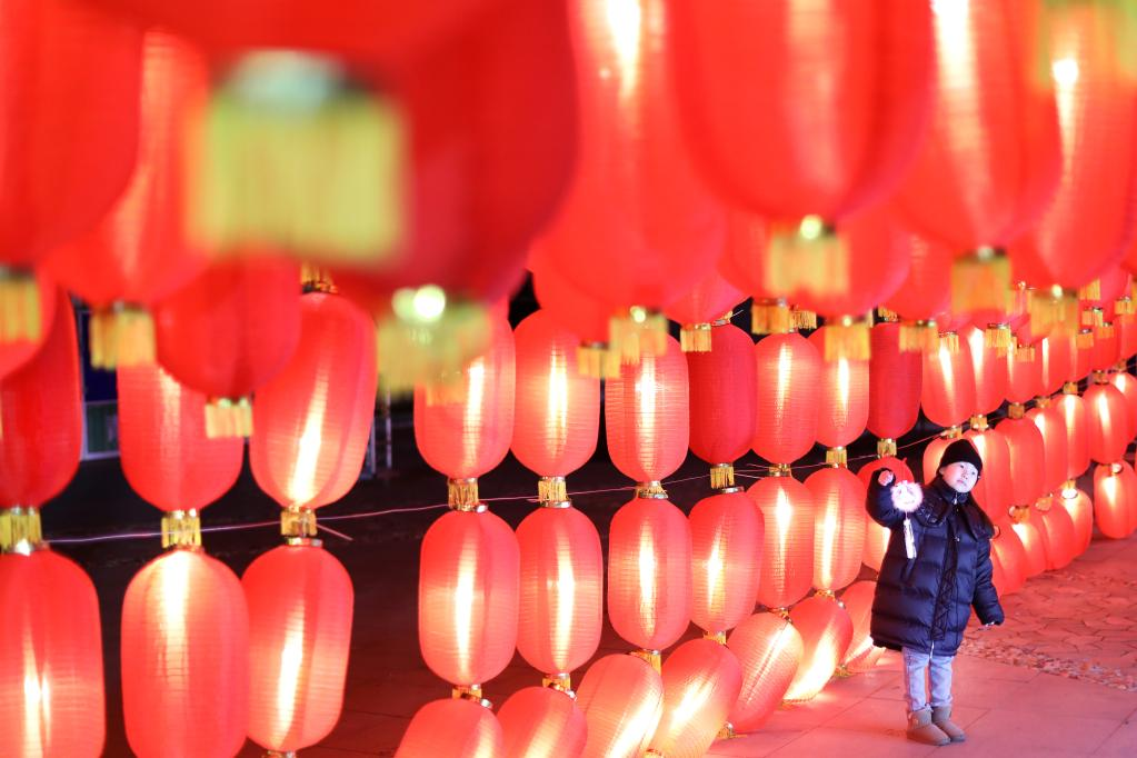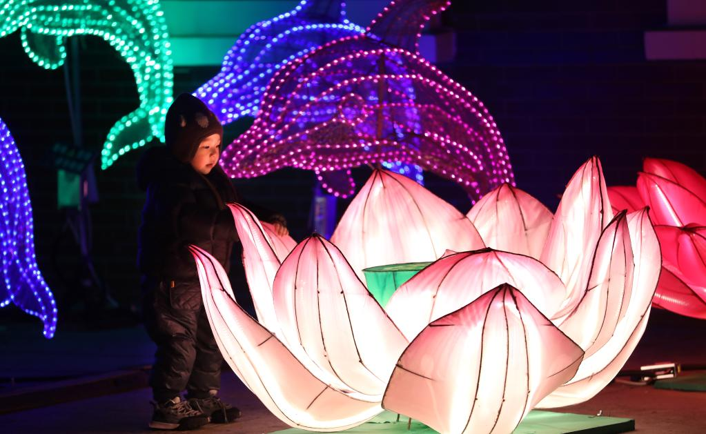 2月3日,一位小朋友在营口辽河老街的莲花形花灯前游玩。