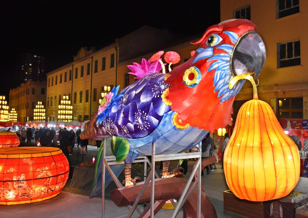 青岛市市南区大鲍岛小广场上布置的鹦鹉彩灯(2月1日摄)。
