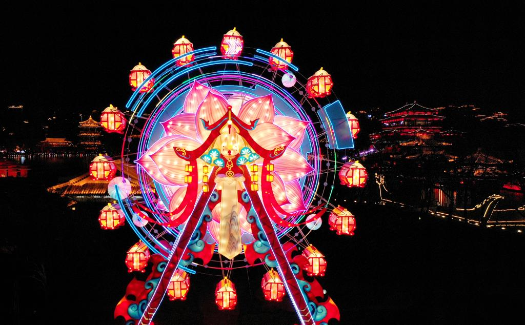 夜幕降临,西安大唐芙蓉园内万盏花灯璀璨绽放,在仿唐式园林的亭台楼阁、廊桥水波之间,灯与景交相辉映,美轮美奂。