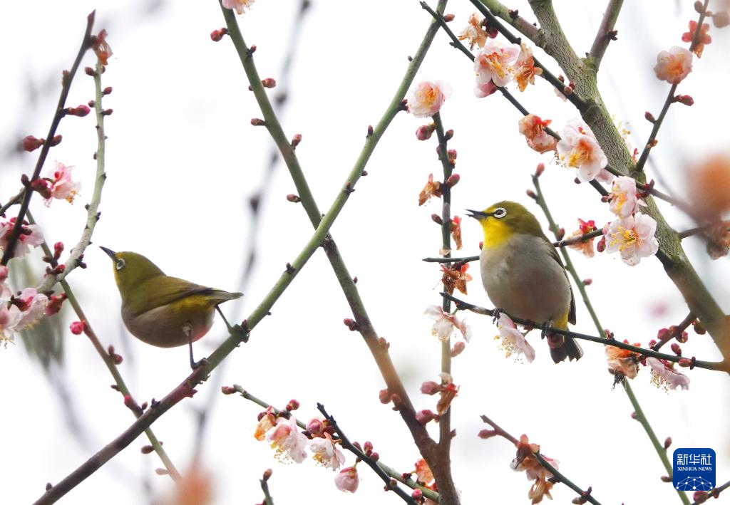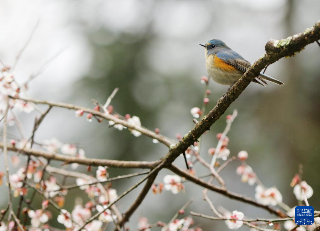 2月9日,在湖南张家界国家森林公园黄石寨梅园,小鸟在枝头停歇。