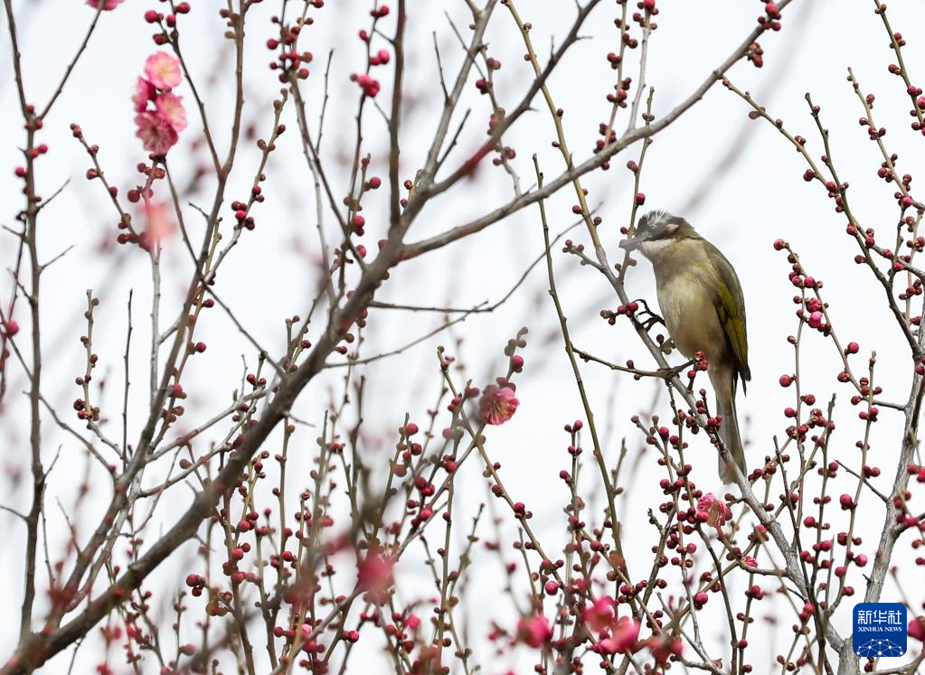 2月8日,在江苏淮安,白头鹎在红梅枝头栖息。