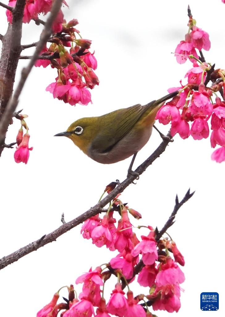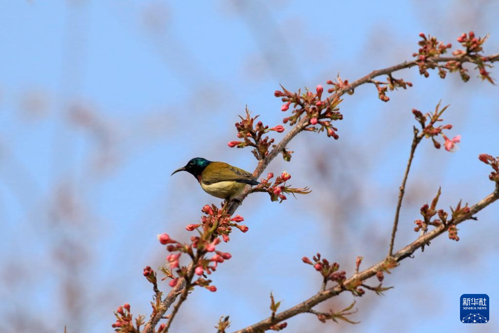 2月6日,在广西南宁市青秀山风景区樱花园,一只小鸟站在春花的枝头“闹”春。