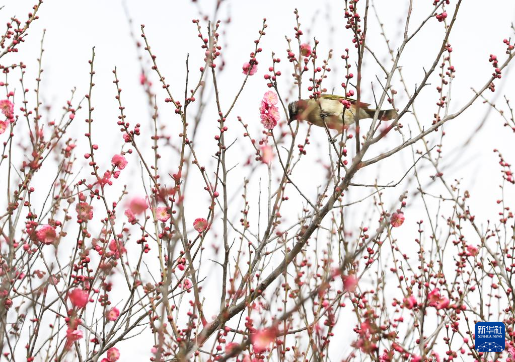 2月9日,在湖南张家界国家森林公园黄石寨梅园,小鸟在花枝上停歇。