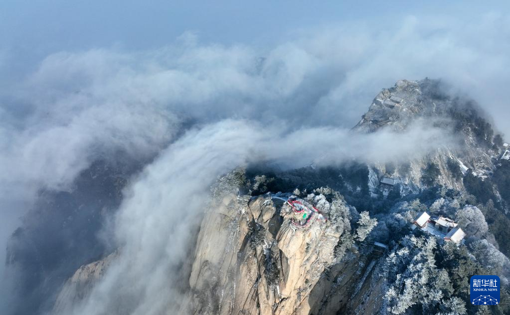 2月9日,云雾笼罩下的华山南峰(前)(无人机照片)。