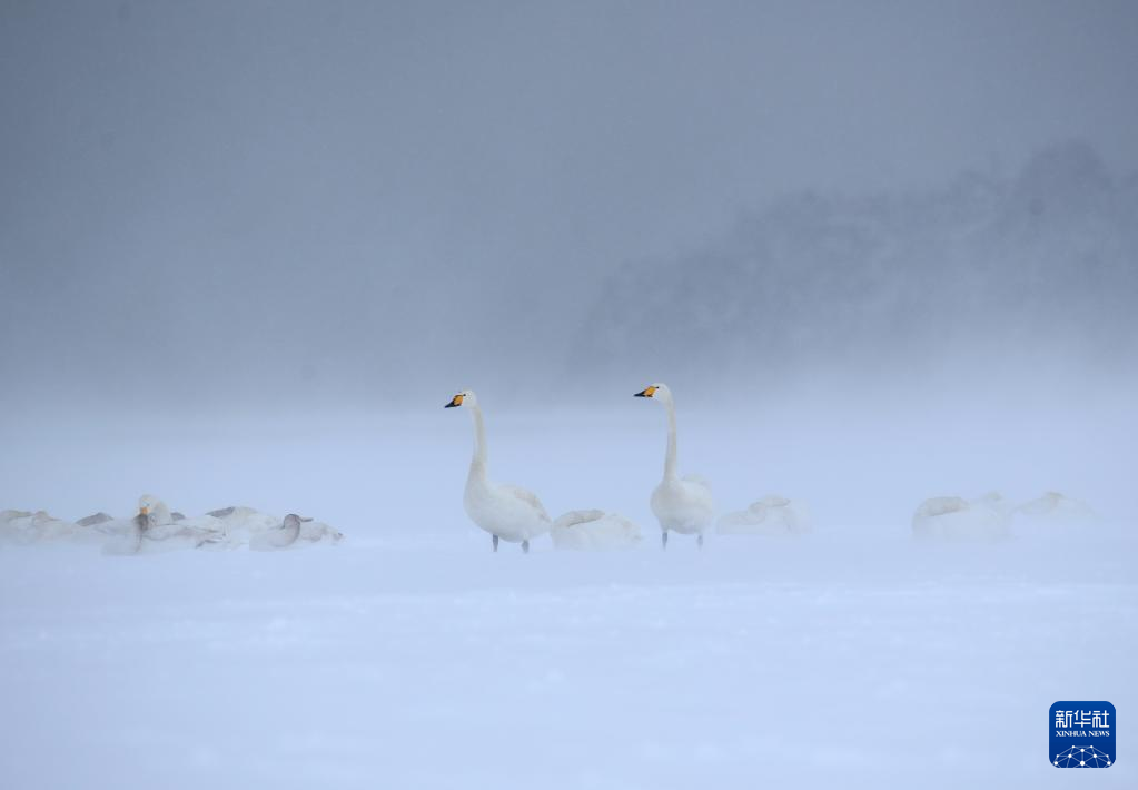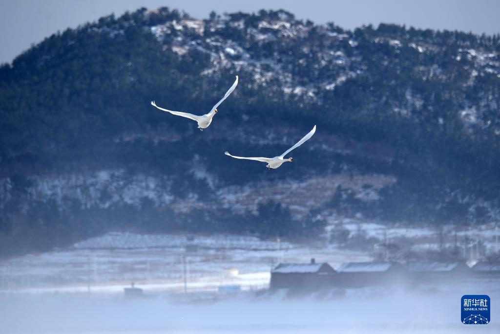 近日,山东荣成出现降雪。在荣成天鹅湖,大天鹅迎风戏雪,翩翩起舞。