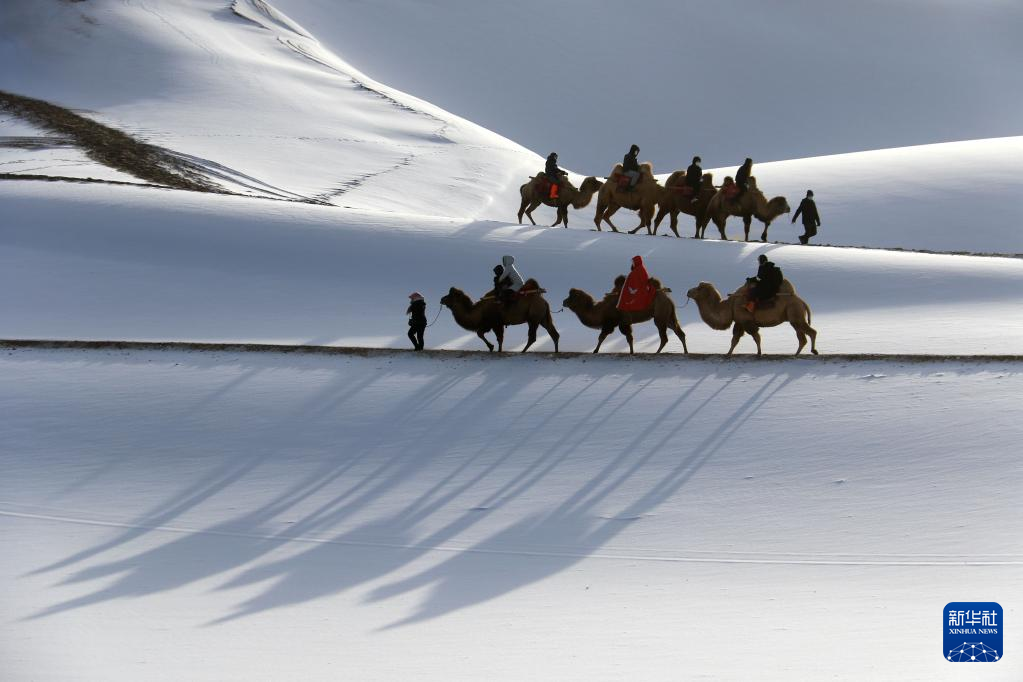 1月14日,游客在甘肃省敦煌市鸣沙山月牙泉景区游览。