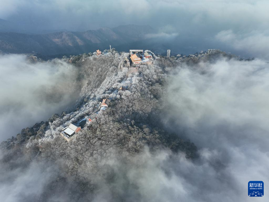当日,雪后的河北唐山市迁西县出现云海雾凇景观,山峰、树木、古建筑在云雾中时隐时现,美如画卷。