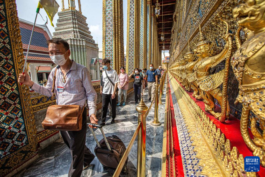 2月7日,中国旅游团游客在泰国曼谷大王宫景区游览。