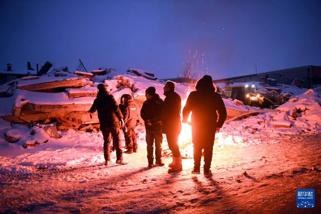 2月7日晚,在土耳其卡赫拉曼马拉什省南部的埃尔比斯坦地区,救援人员在废墟旁烧火取暖。