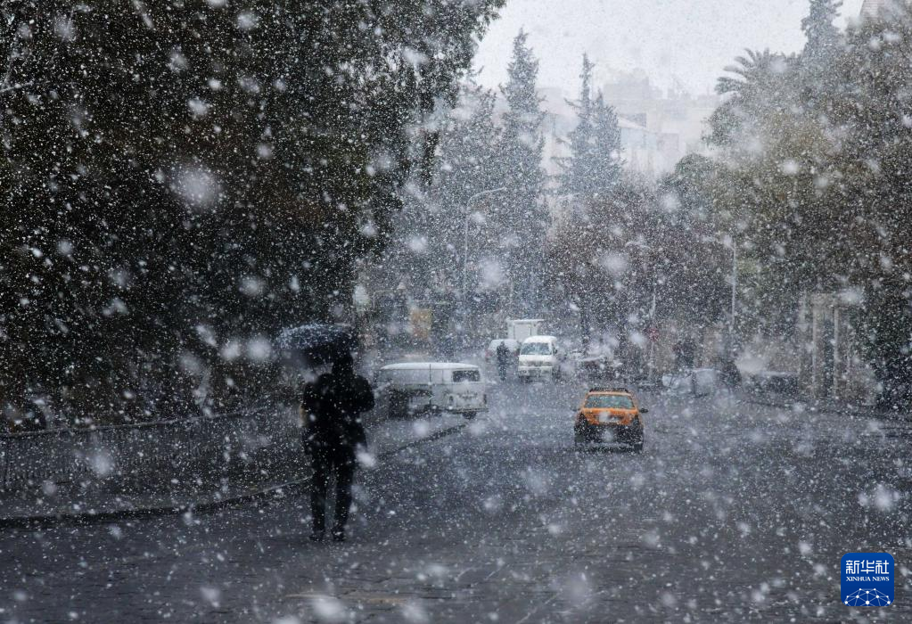 2月8日,行人走在雪中的叙利亚首都大马士革街头。