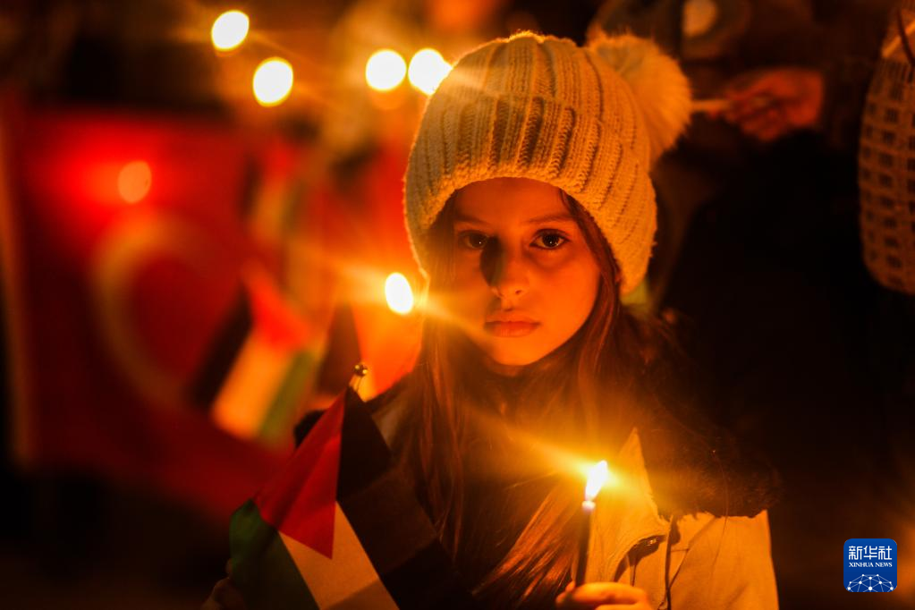 2月7日,在加沙地带汗尤尼斯,一名儿童手拿蜡烛悼念地震遇难者。