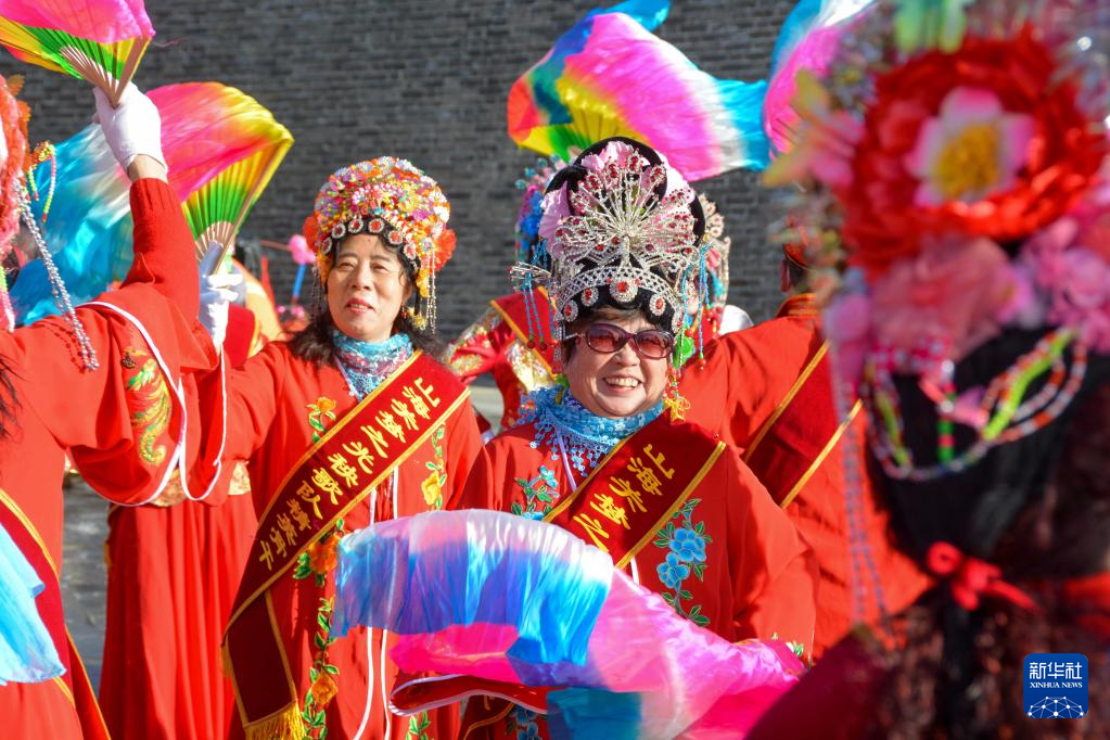 2月19日,在河北省秦皇岛市山海关区,民间艺人进行秧歌表演。