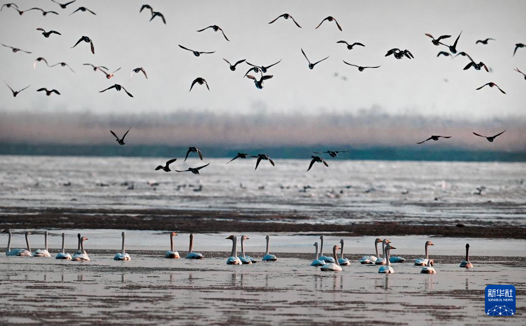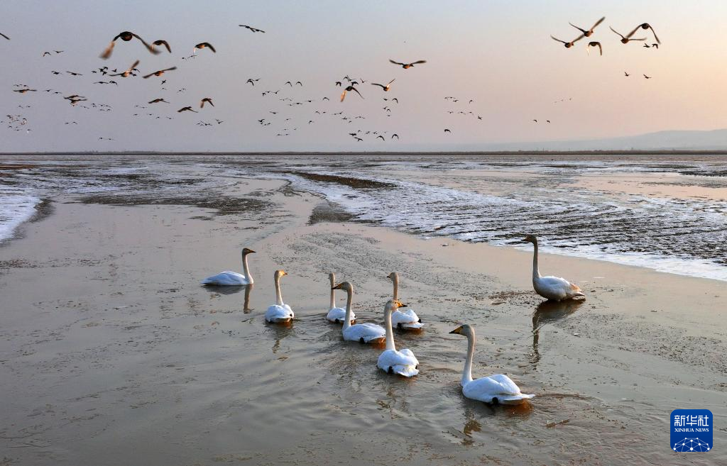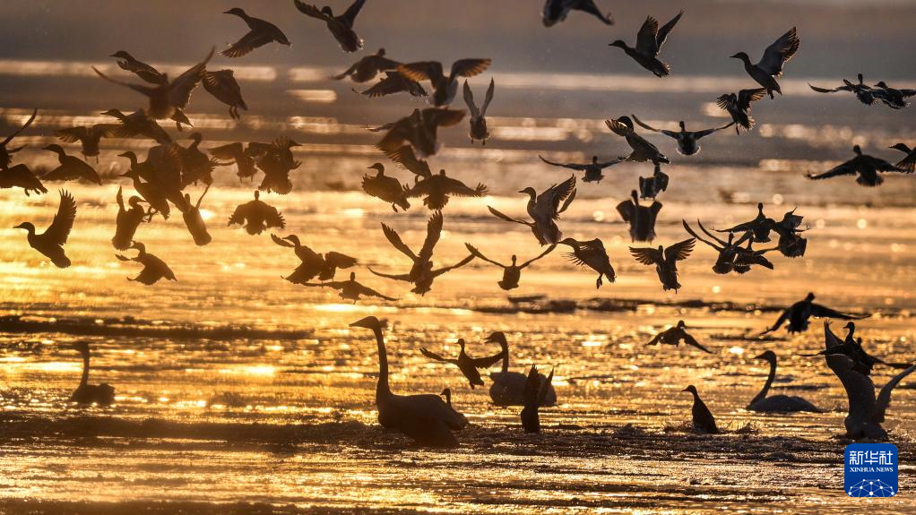 黄河西岸的合阳黄河湿地自然保护区内,群鸟翔集嬉戏。新华社发(赵晓罡 摄)