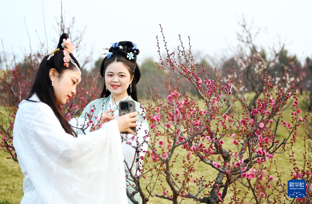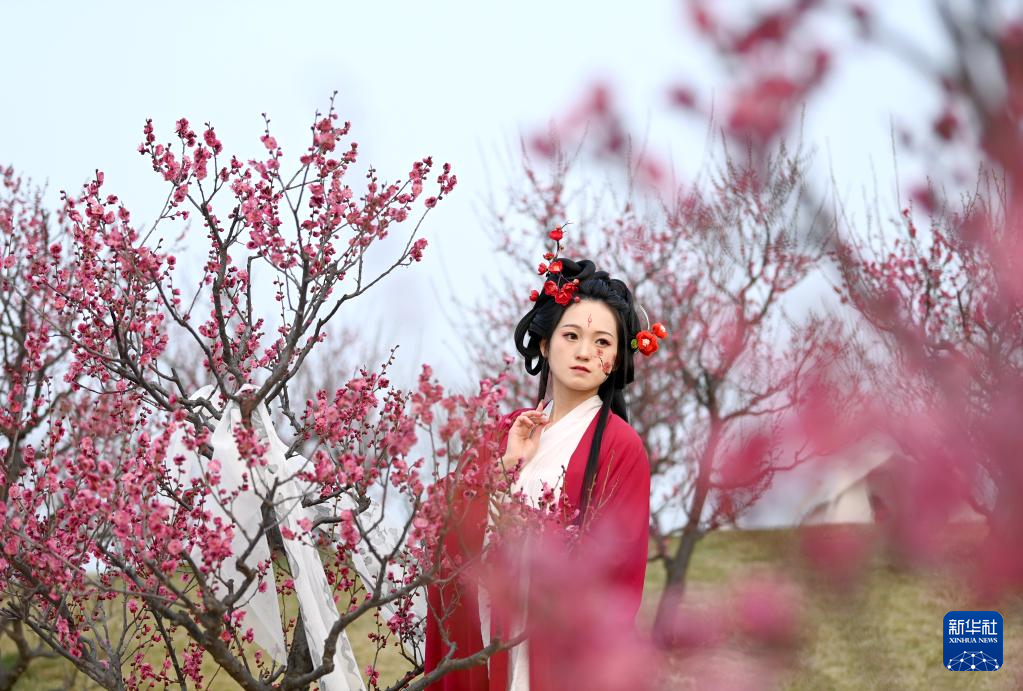 2月25日,古风爱好者在长安唐村梅园内拍摄视频。