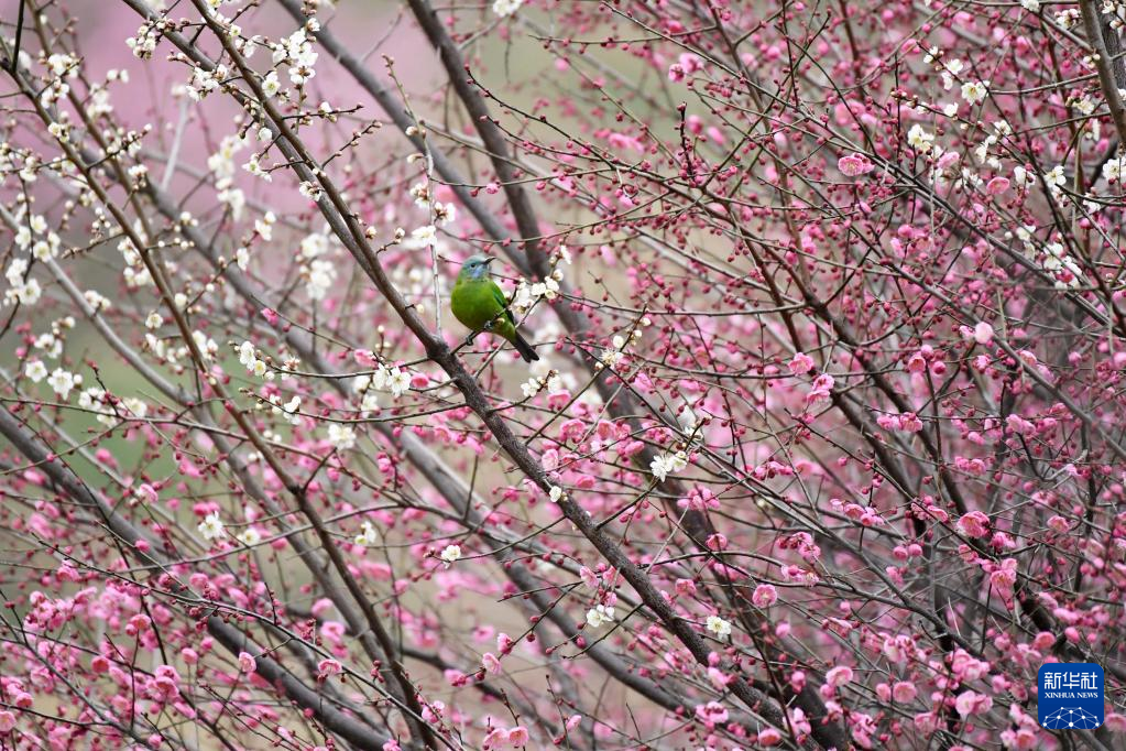 2月16日,在贵州省仁怀市楠竹林公园,一只小鸟在梅花枝头停歇。