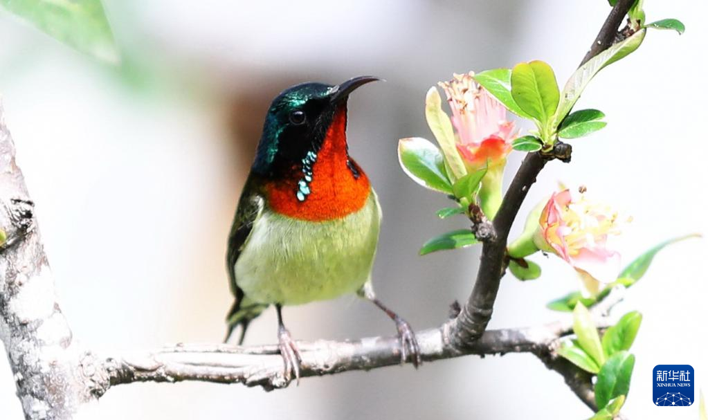 在四川省达州市通川区大寨子公园,一只太阳鸟在花枝上停歇。新华社发(曾猛 摄)