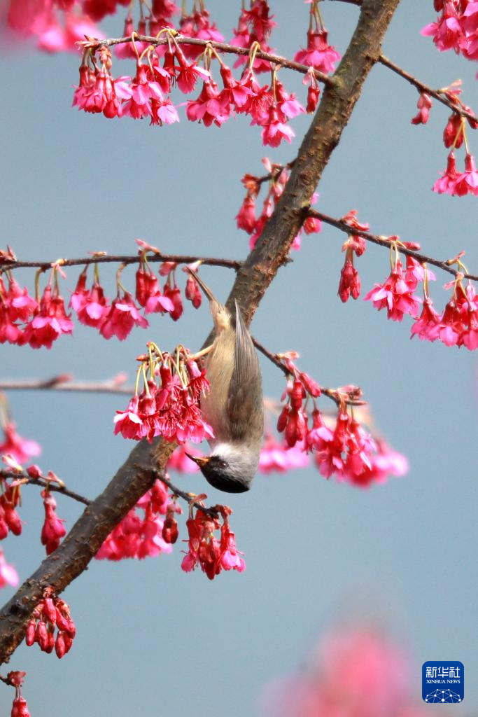 小鸟在湖北省宜昌市秭归县九畹溪镇界垭村的樱花树上觅食。新华社发(王罡 摄)