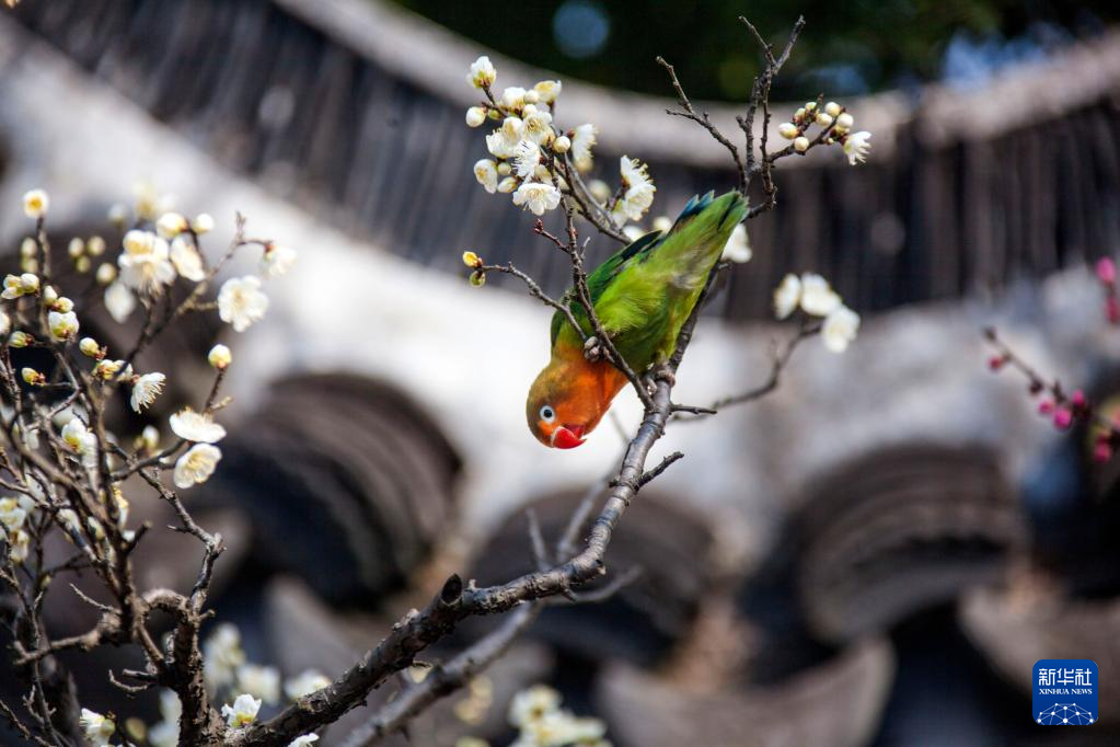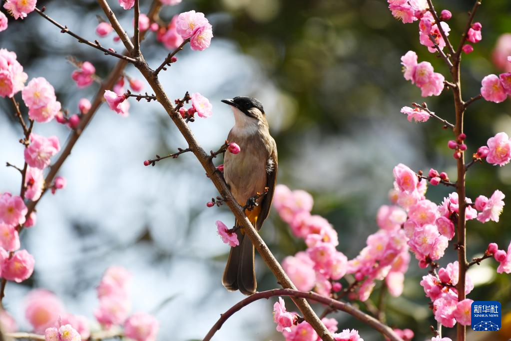 小鸟在贵州省仁怀市街边的梅花枝头停歇。新华社发(陈勇 摄)
