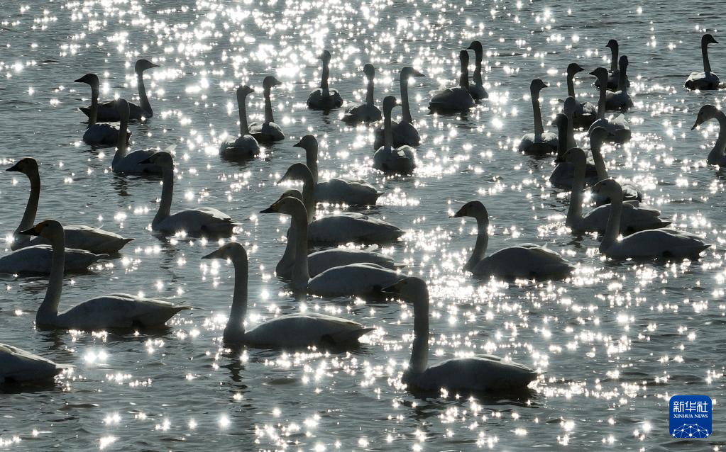 2月25日,天鹅在河北省唐山市曹妃甸湿地水面上游弋。
