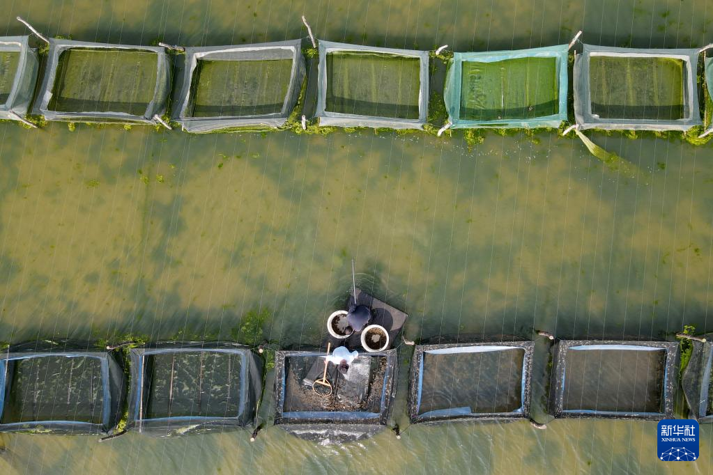 3月9日,在安徽省蚌埠市五河县申集镇,蟹农从网箱中捞出培育好的蟹苗(无人机照片)。