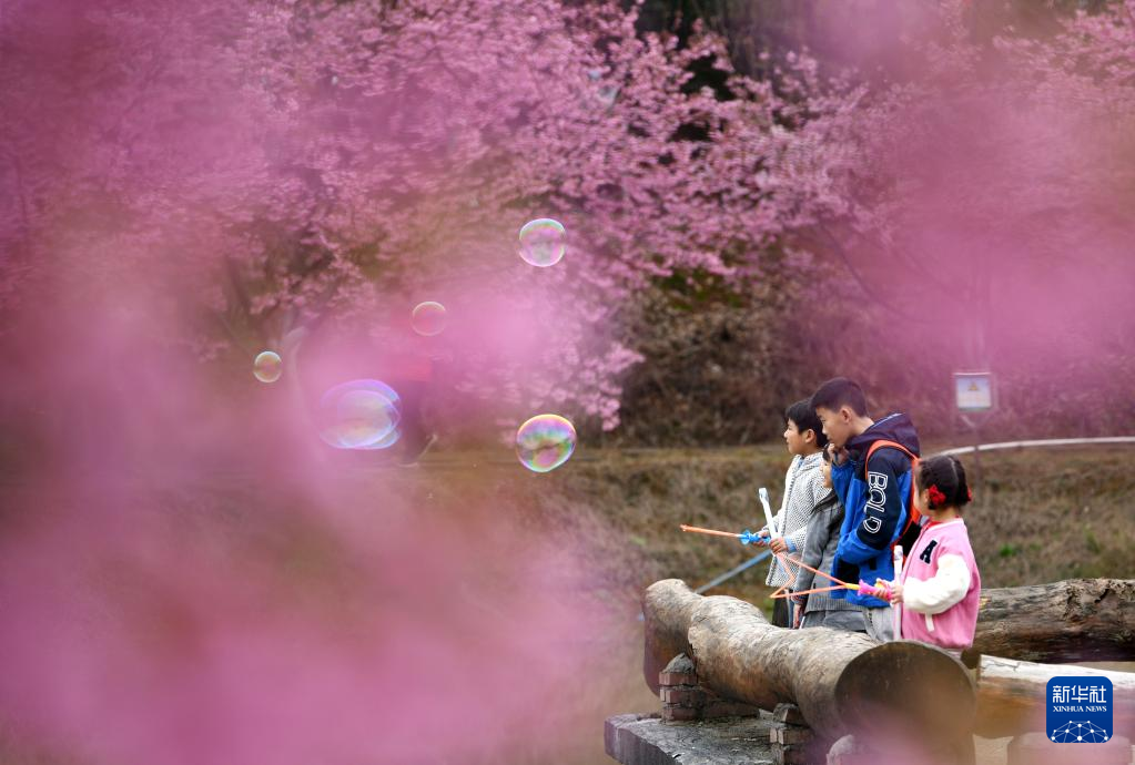3月4日,小朋友在湖南省常宁市罗桥镇樱花园内玩耍。