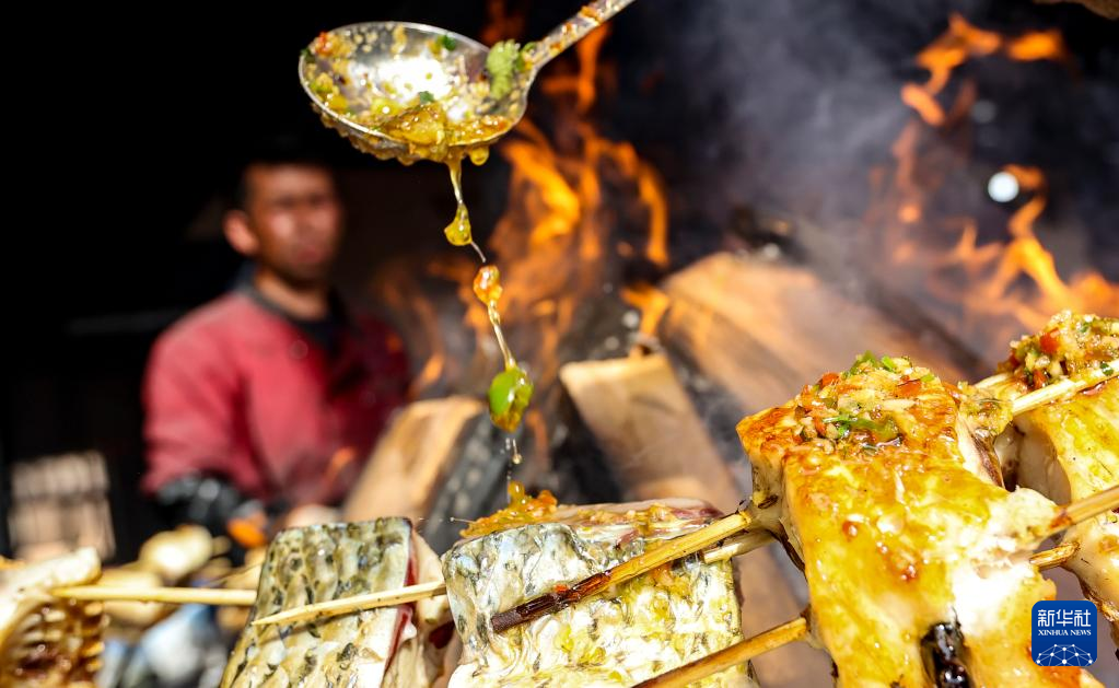 2月26日,在新疆喀什地区疏附县托克扎克镇农贸市场的一处摊位前,摊主给炙烤的鱼块淋上料汁。