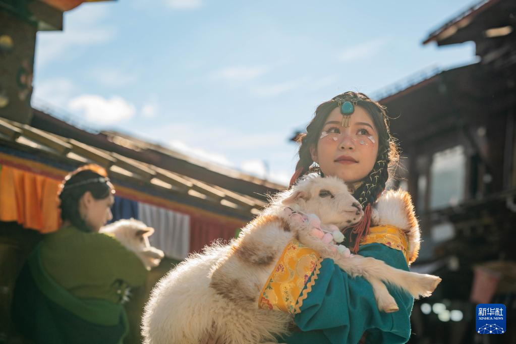 3月8日,游人在独克宗古城里抱着小羊拍照留念。