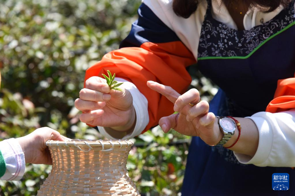 4月23日,茶园工作人员讲解如何采摘茶叶。