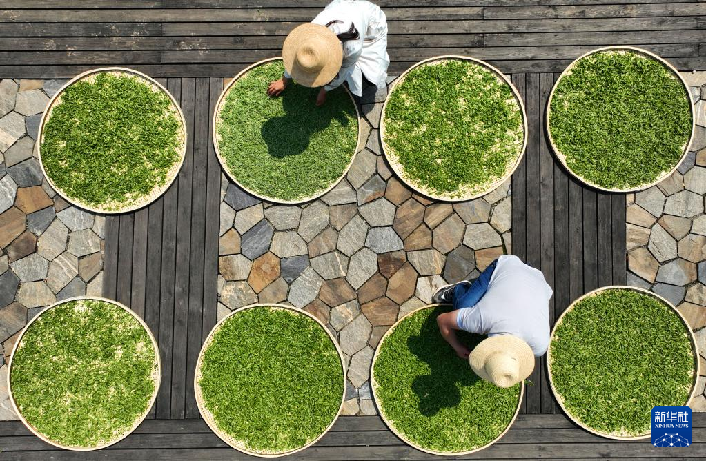 3月15日,在湖南省衡阳市衡东县白莲镇小初茶场,茶场员工在挑选摊晒春茶(无人机照片)。