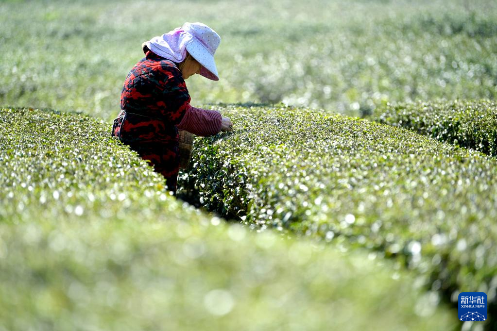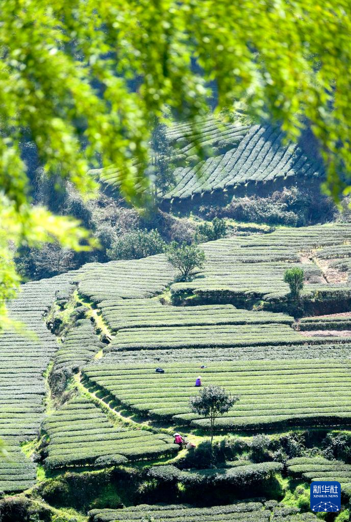 3月15日,湖北省恩施土家族苗族自治州宣恩县椒园镇的茶农在茶园里采摘春茶。