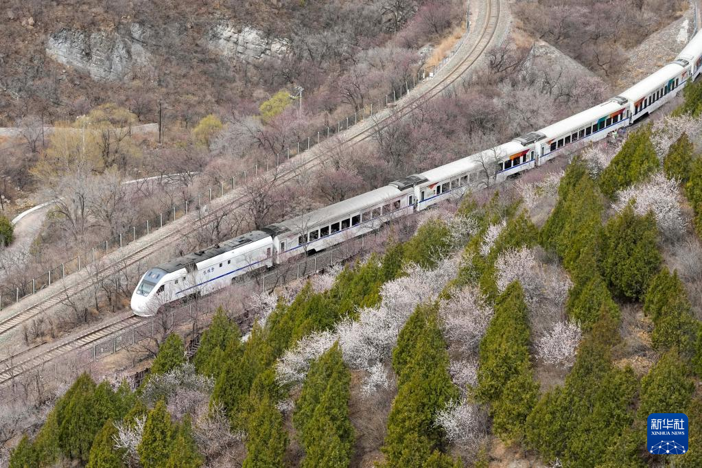 3月23日,一列S2线列车行驶在北京居庸关长城脚下花海中。