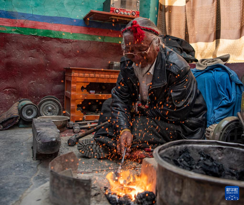 拉孜孜龙藏刀锻制技艺第六代传人次旦旺加在制作藏刀(3月10日摄)。