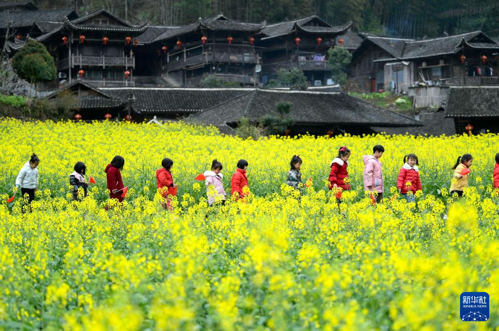 3月18日,孩子们在湖北省宣恩县彭家寨古吊脚楼前的油菜花田里行走。