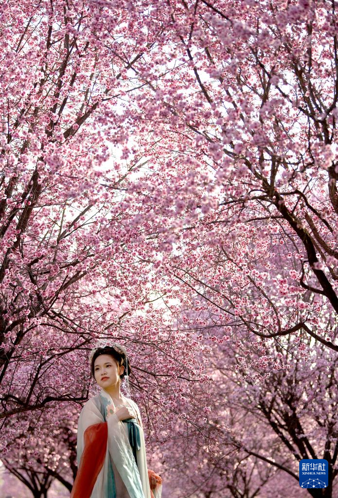 3月14日,古风爱好者在西安大明宫国家遗址公园内赏花留影。
