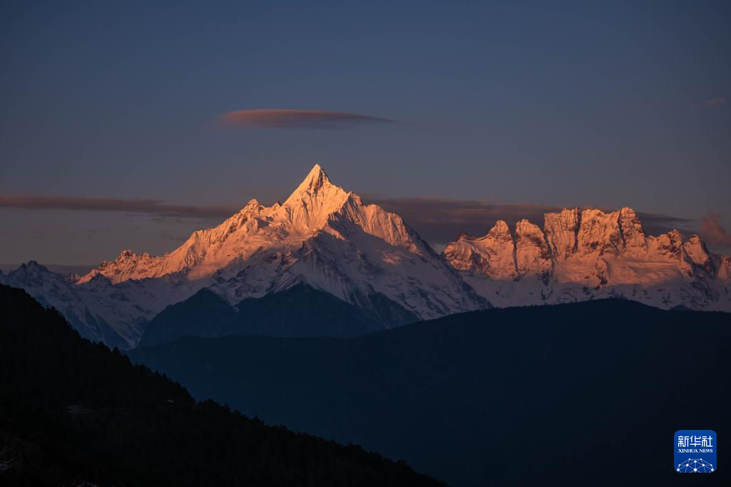 3月10日日出时分拍摄的梅里雪山,皑皑雪峰在金色晨光映照下如披金纱。梅里雪山位于云南省迪庆藏族自治州德钦县与西藏自治区林芝市察隅县交界处,是世界自然遗产“三江并流”的主要景观之一。