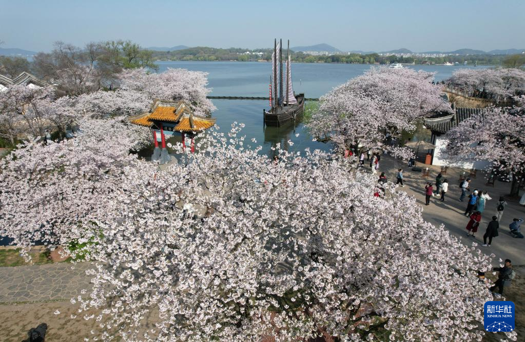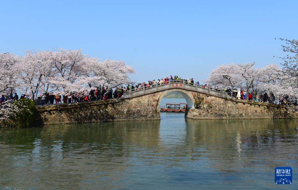 近日,江苏无锡太湖鼋头渚景区里樱花盛放,众多游客前来赏樱游玩。