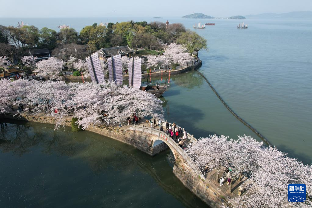 近日,江苏无锡太湖鼋头渚景区里樱花盛放,众多游客前来赏樱游玩。