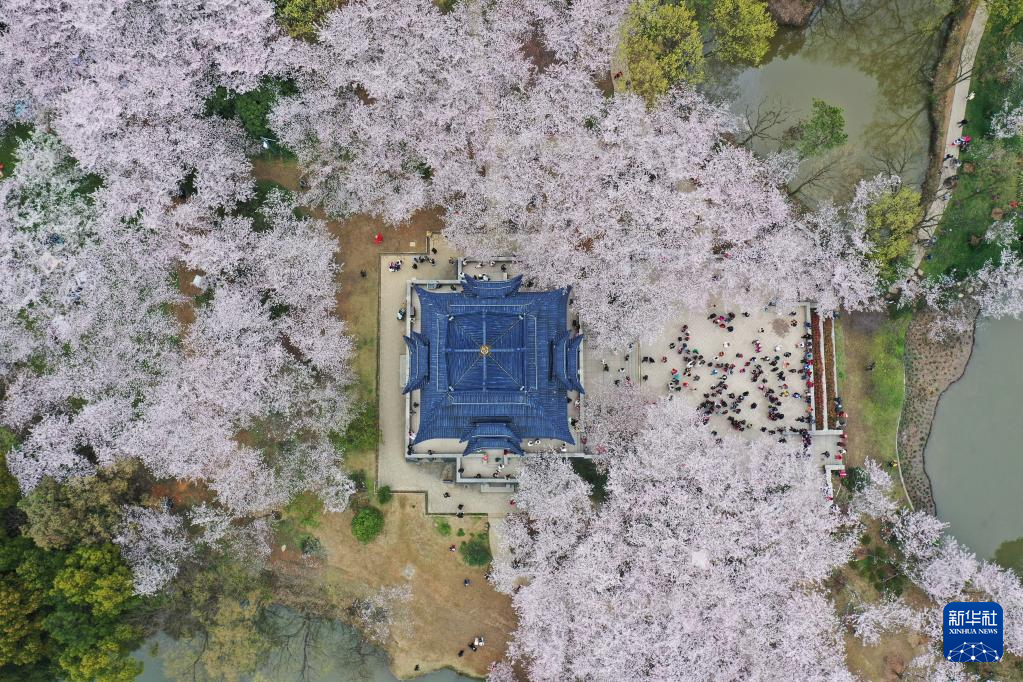3月28日,游人在无锡太湖鼋头渚景区赏樱游玩(无人机照片)。