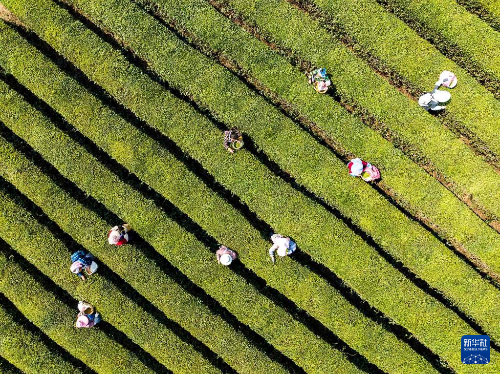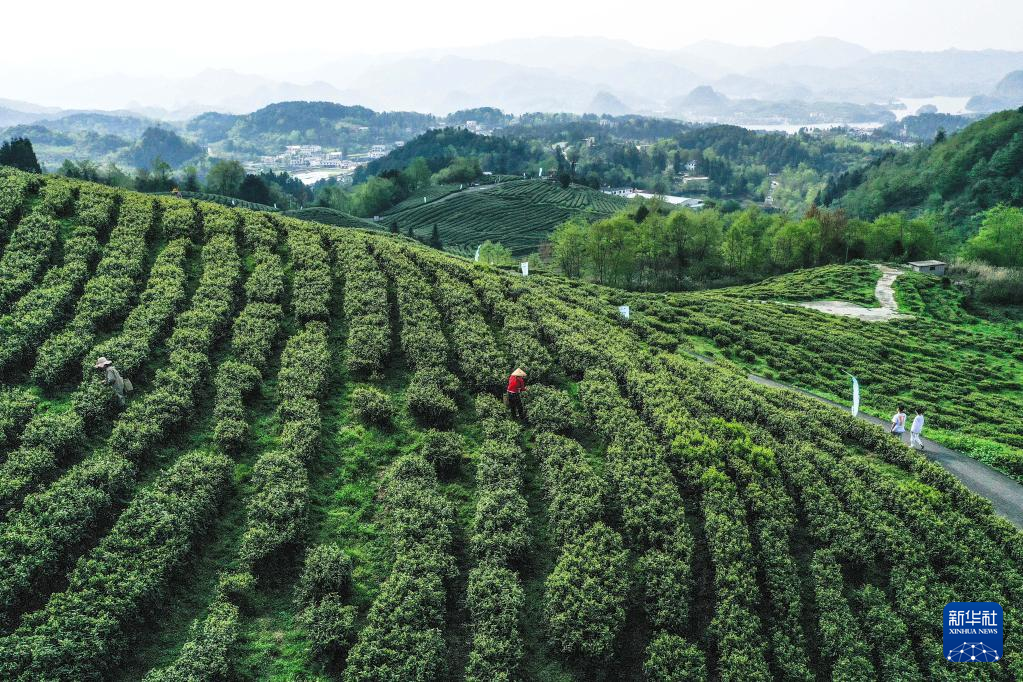 4月2日,村民在贵州省贵阳市神鹊茶场采摘春茶(无人机照片)。