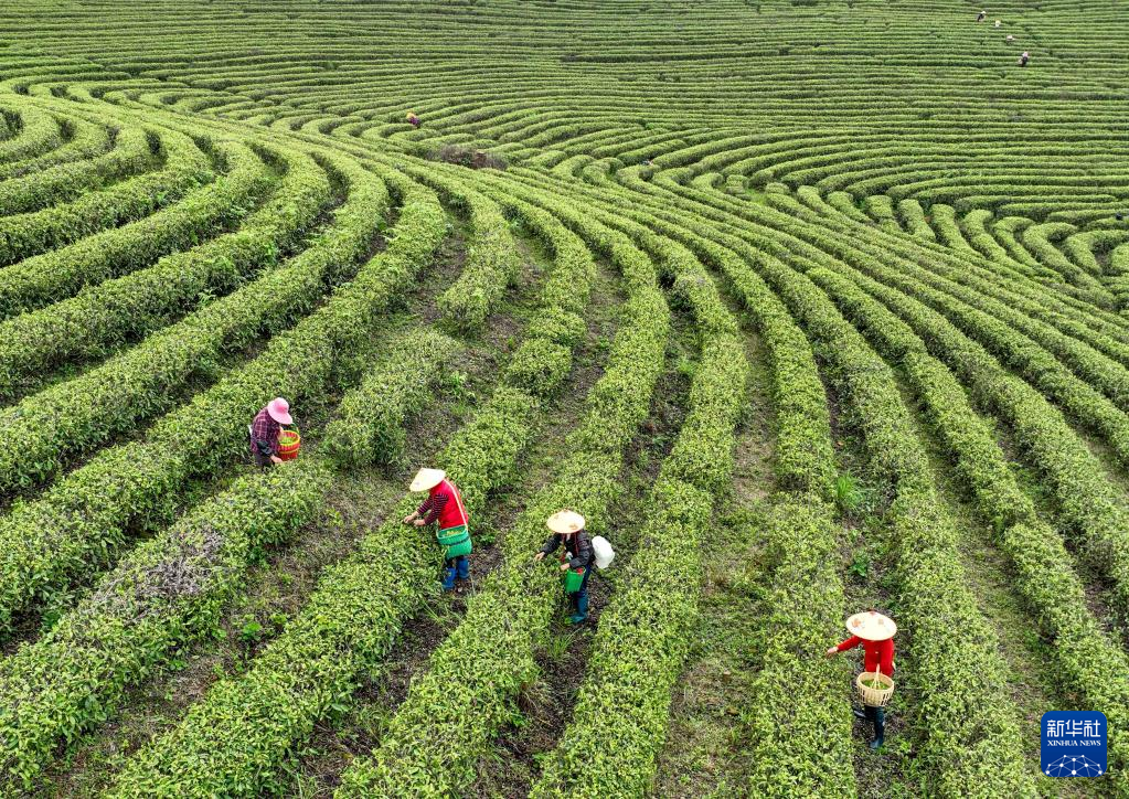 4月1日,茶农在湖南省怀化市通道侗族自治县九层岭茶园采摘明前茶。