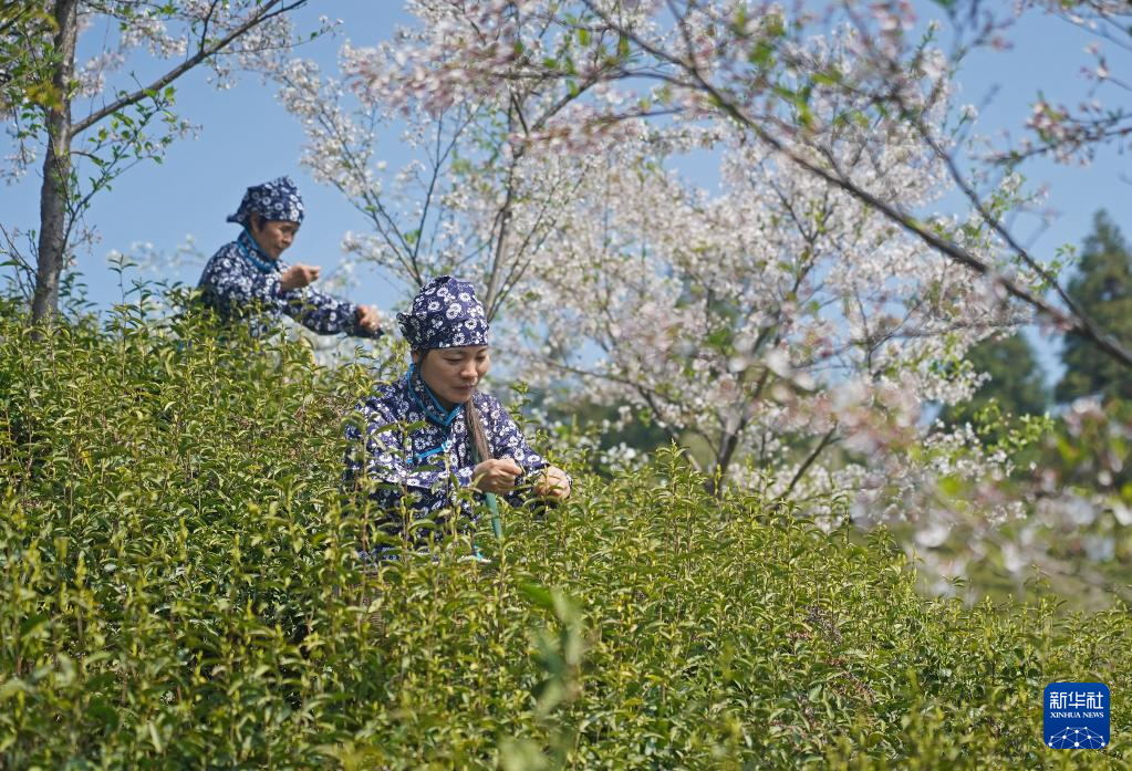 4月2日,茶农在贵州省安顺市西秀区双堡镇一茶园采摘明前茶。