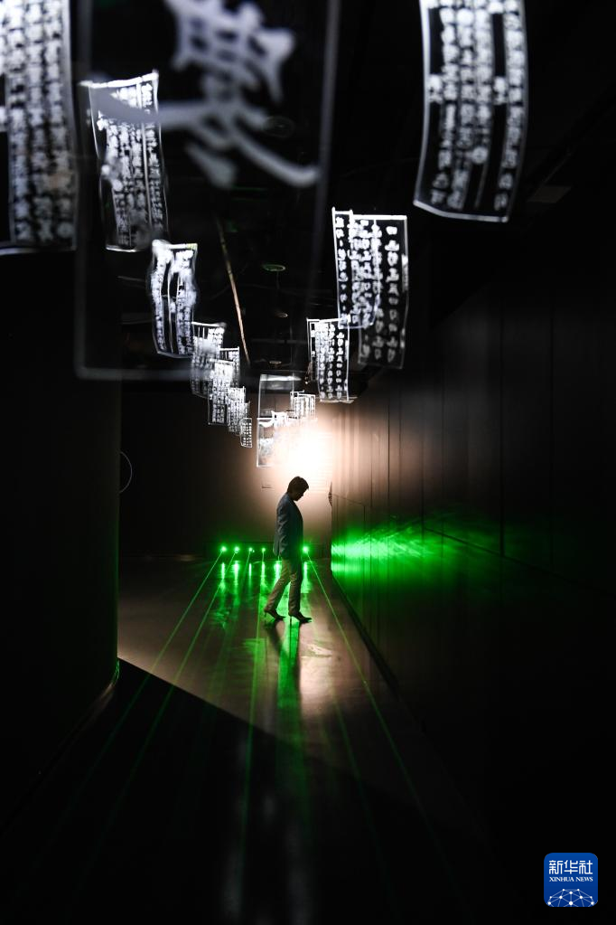 4月21日,一名读者在嘉兴市图书馆元宇宙阅读体验馆内通过触碰不同光线来感受音律的变化。