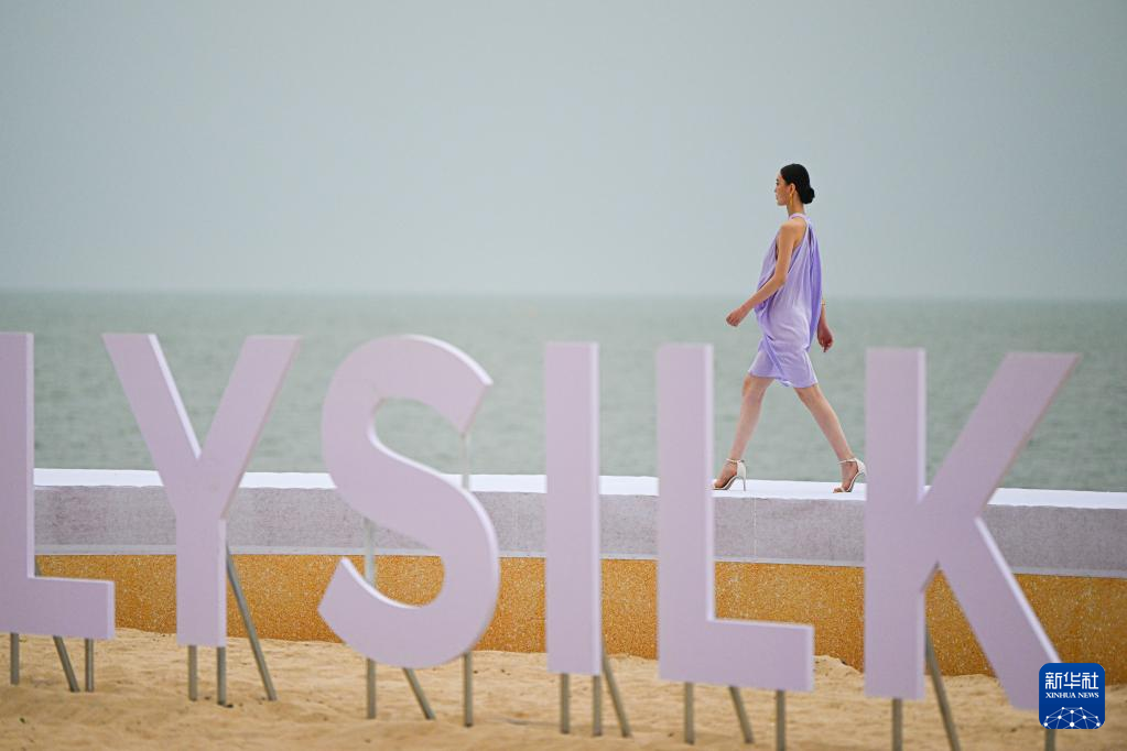 4月12日,模特在消博会时装周海边秀场展示时装作品。