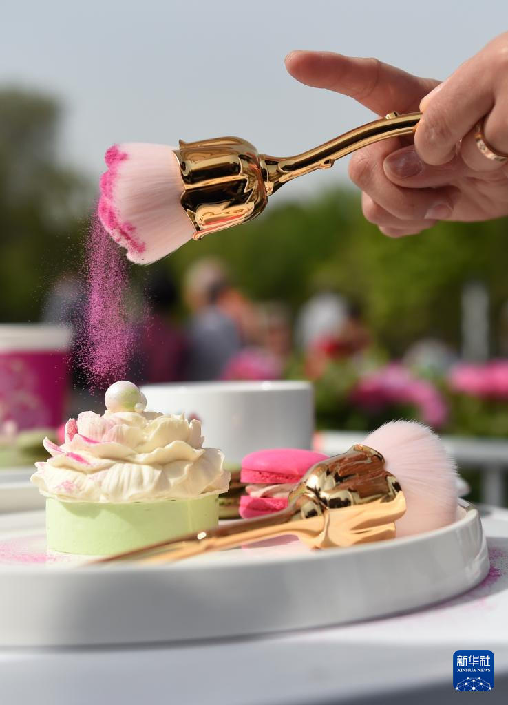 4月19日,工作人员展示圆明园推出的以牡丹花为主题的甜品,游客可以自己动手,将粉红色的果粉撒在牡丹花造型的甜品上。