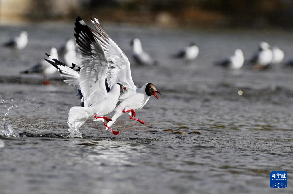 棕头鸥在拉萨河上嬉戏(4月16日摄)。